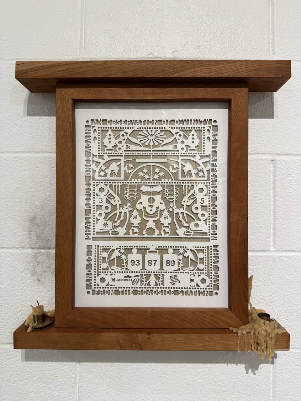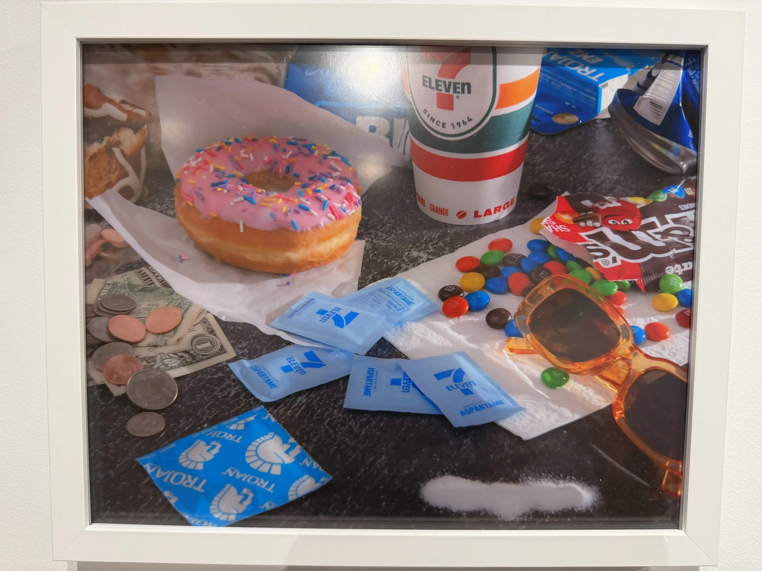 “Gas stations are America’s accidental museums—fluorescent-lit shrines to kitsch, camp, and chaotic consumerism. Exploring gas station merchandise through art becomes a way to examine the surreal poetry of the roadside: airbrushed wolves on velvet, rhinestone trucker hats, Jesus candles, lottery tickets, and beef jerky side by side like some late capitalist still life. These one-stop culture convergence points are where regional identity, mass production, nostalgia, and irony collide in glorious overstatement. Through this lens, the gas station becomes more than a pit stop—it’s a stage where taste, myth, and marketing merge, inviting artists to remix its offerings into a new visual vernacular.”